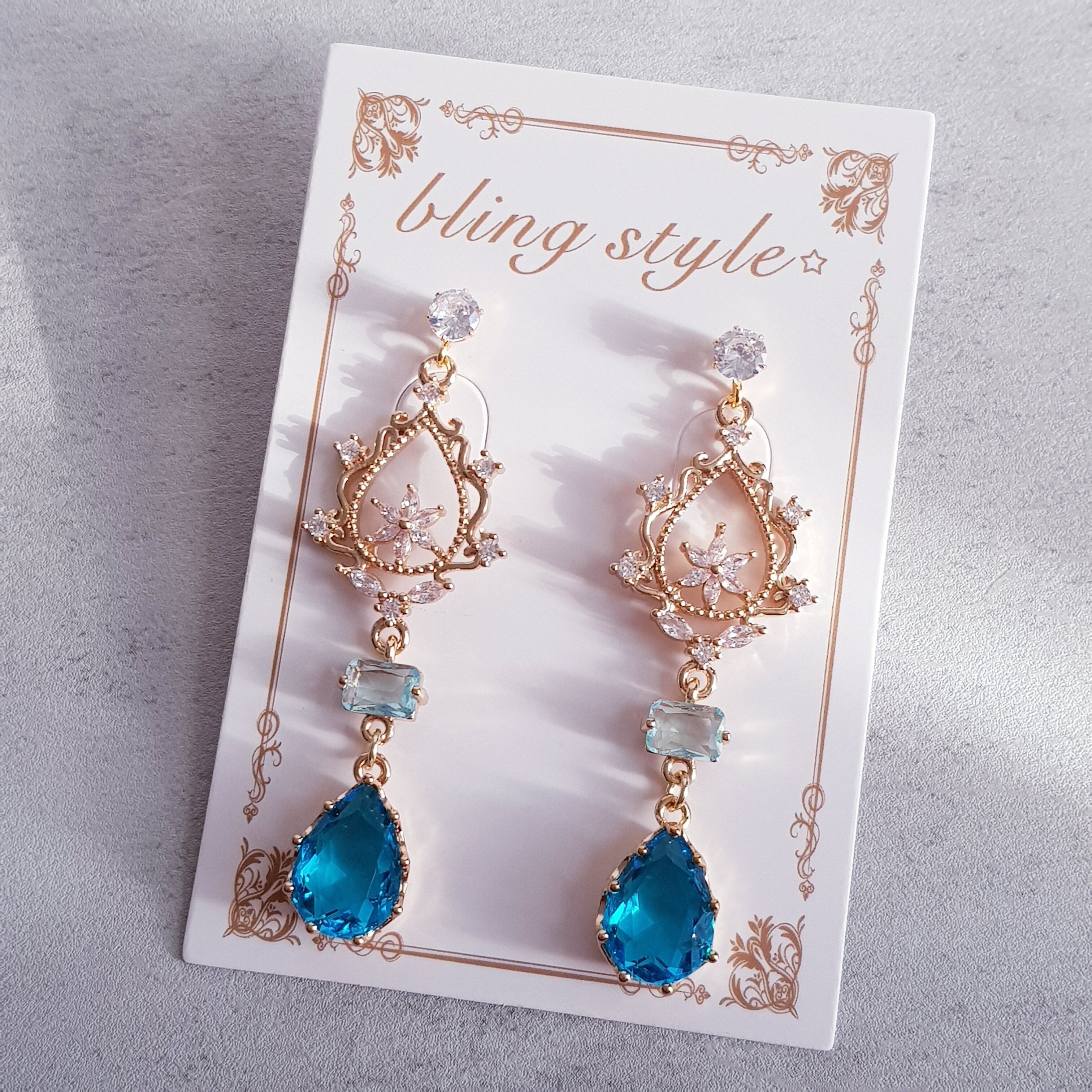 ブルー cz フラワー クリスタル ドロップ ピアス イヤリング
