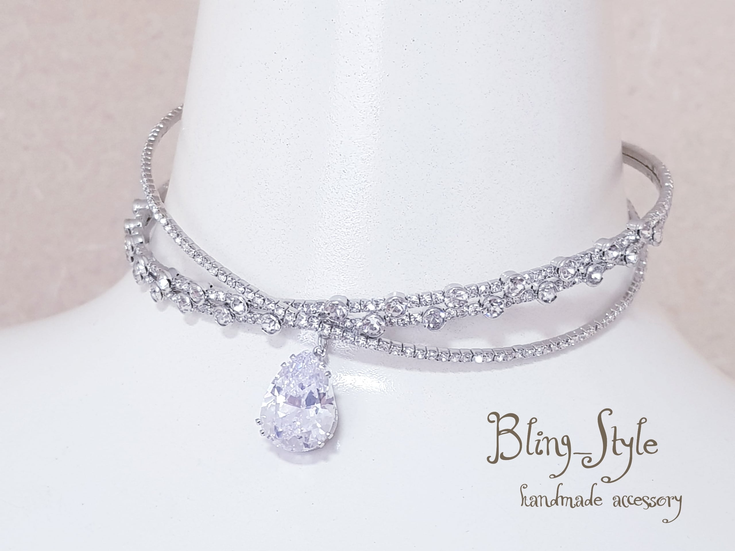 シルバー ラインストーン クリスタル ドロップ チョーカー ネックレス