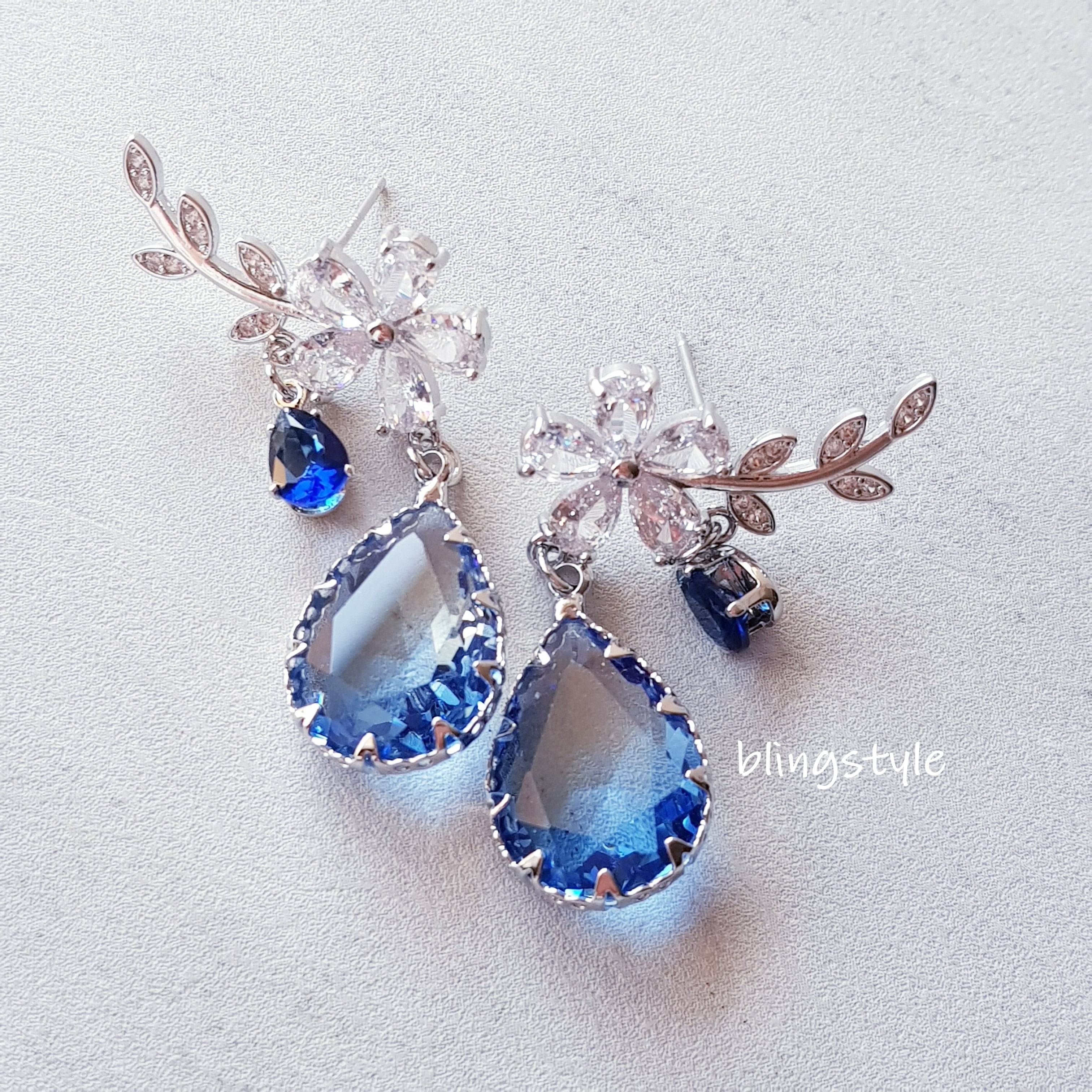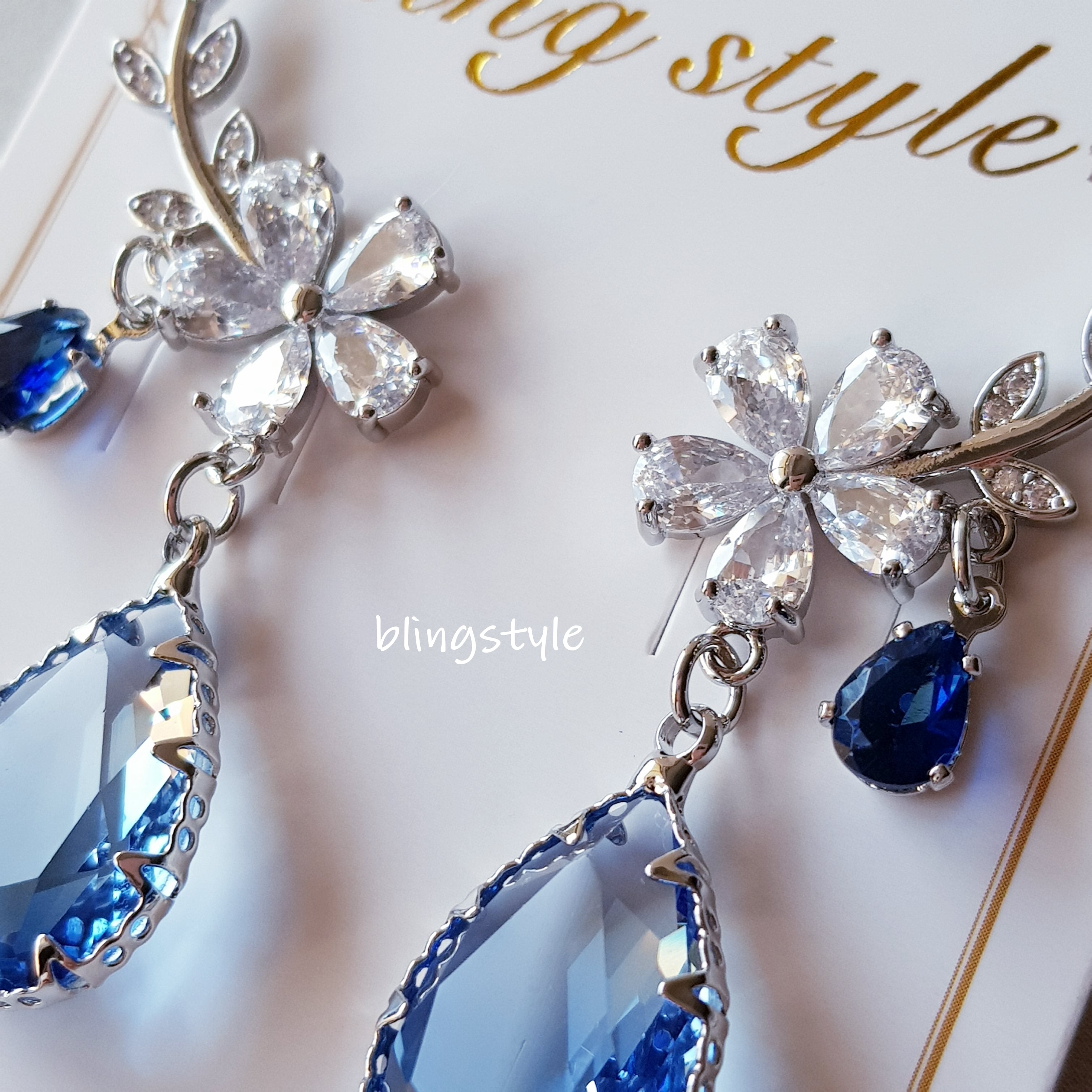 シルバー フラワー cz ブルー グラデーション ドロップ ピアス イヤリング